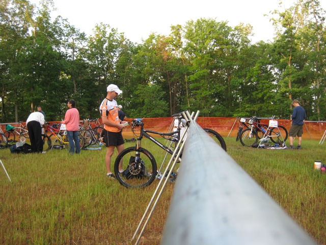 My transition went fairly smoothly, although I’ve definitely had quicker and smoother. The bike course was still pretty wet from the rain the night before. During a pre-ride several weeks back, the course was in much worse shape. Back then, it was very, very muddy and quite torn up from a recent horse riding event. During the race, it wasn’t quite as muddy in the usual bad spots. Instead, some of the sections that were normally dry and very fast were now wet and “greasy”. On several occasions during the race, I felt as if I was out of control. Not a good position to be in with as fast as I was trying to ride.