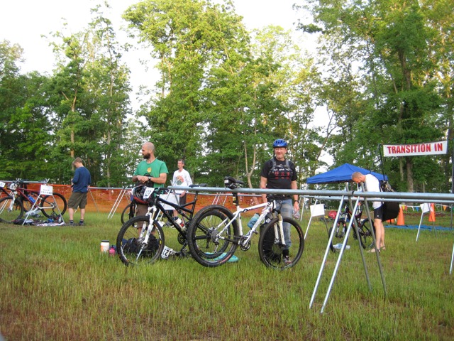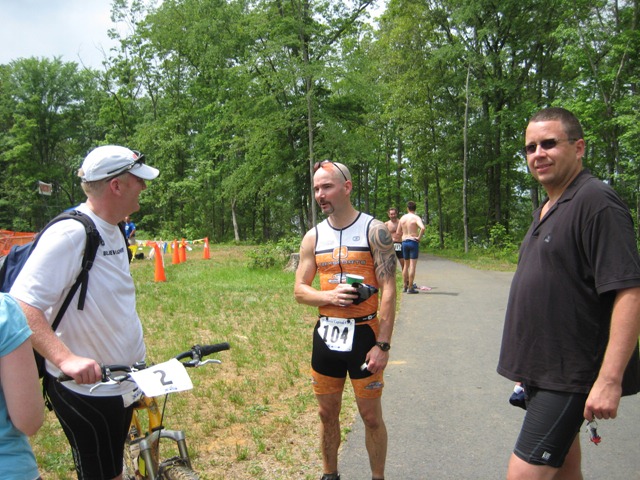 Alba and I showed up right around 6:30 and I began setting up in transition. I met up with lots of folks. Included in the bunch were Andrew Jones and Peter Lilly. Also present was Xterra first-timer (and 2nd triathlon), Dirk Wuensche.