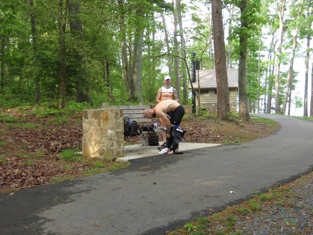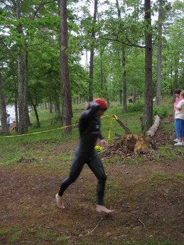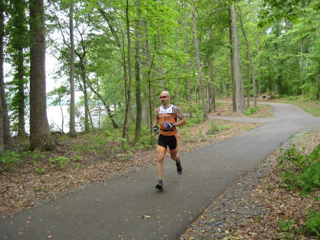 With my right leg stiff as a board, I hopped off the left pedal and hobbled the rest of the way back to my rack. I bent the right leg a couple of times to loosen it. The relief was short-lived. As soon as I attempted to take one of my shoes off, BOTH of my quads seized. I grabbed the bike rack with both hands, bent over with my head between my arms and tried my best to cover up the yelp I let out. As I stood there feeling like a pirate with two peg legs, I quickly remembered moving helped. I danced around a bit bending the legs several times. Somewhere in the midst of doing my little dance, I managed to change shoes and hobble out of transition. I ran down the short paved path towards the trail head, trying my best to regain control of my legs.