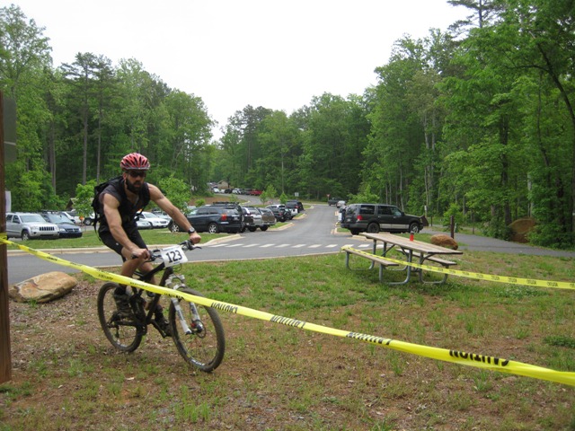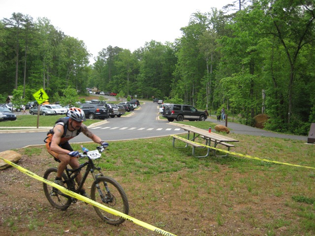 Towards the tail end of the second lap, my quads began to cramp on one of the last climbs. I decided to hop off and hoof it up the hill on foot and to give me an opportunity to stretch my quads. It seemed to do the trick as they loosened up before getting to the top of the hill. I quickly learned that moving = no seizing. There were two others walking the same hill which made me feel a little better about doing it myself. (By the way, walking hills in Uwharrie is not uncommon). I made my way down the gravel road, through the parking lot and into transition.