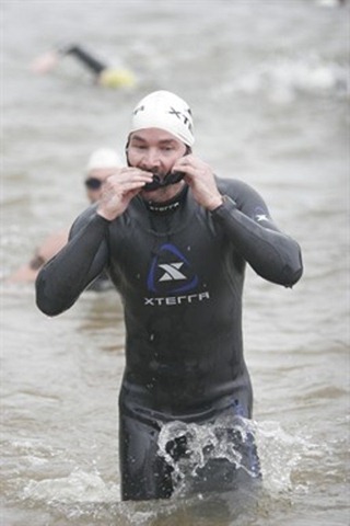 Race started (wetsuit swim) with the pros (not wearing suits) starting 30 seconds ahead of the amateurs. The swim start was pretty chaotic with the usual madness at the beginning. Until I rounded the first buoy, I felt tight in the suit and my shoulders were burning a bit. By the time I hit the second buoy, I was warmed up and feeling pretty good. I had trouble sighting as my goggles were fogging up towards the end of the first lap. I kept the pack of swimmers in front of me in sight and just kept going.
