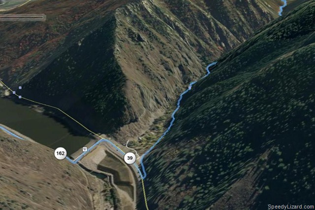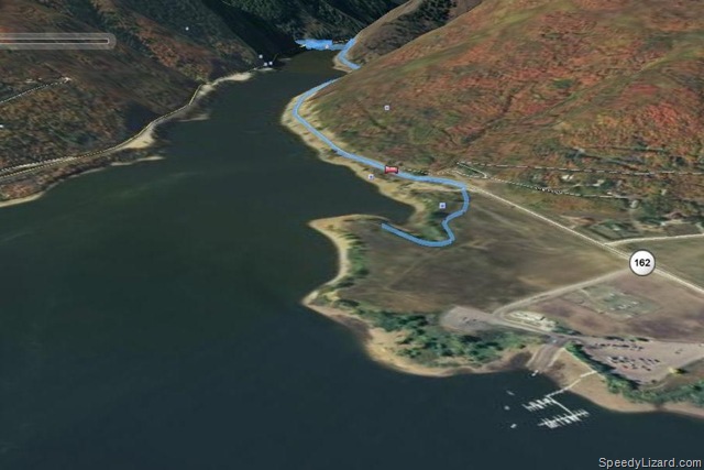 You can see in the first pic below, from transition we followed the edge of Pineview Reservoir. We started from the boat dock area, but it took a few minutes for my Garmin to acquire satellites. When we reached the end of the reservoir damn, we began our ascent up Wheeler canyon. Frank quickly pulled away from me as we reached the dam. I decided to go the conservative route as we climbed. It was tough to concentrate on the race as some of the scenery through the canyon was amazing. To my right was the mountain and to my left was a HUGE drop down into the canyon.