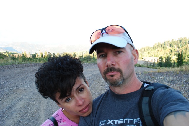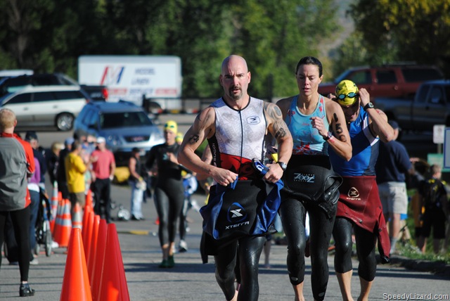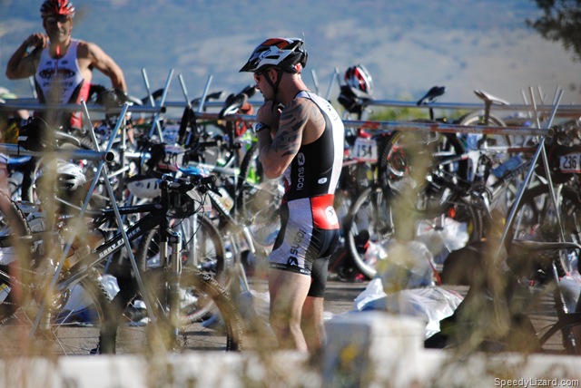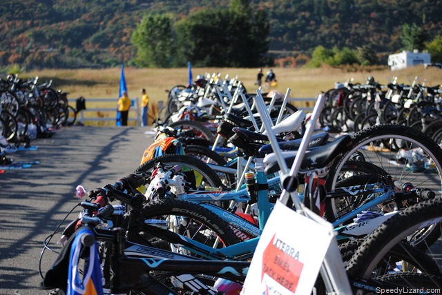 As I came into transition, I saw my friend, Frank Fernandez-Posse (in the MRR jersey below). I ran by him and gave him a smack on the butt. It was hilarious to see the look on his face as he looked up trying to figure out what the heck was going on. We both got our gear on and left transition at the same time. Transition was a bit slower since we had to stuff our wetsuits and other items into a plastic bag for later retrieval. The XTERRA crew gathered all of the bags up and moved them to Snowbasin.