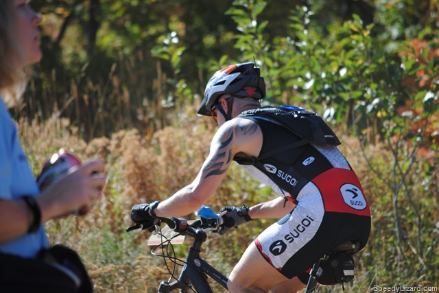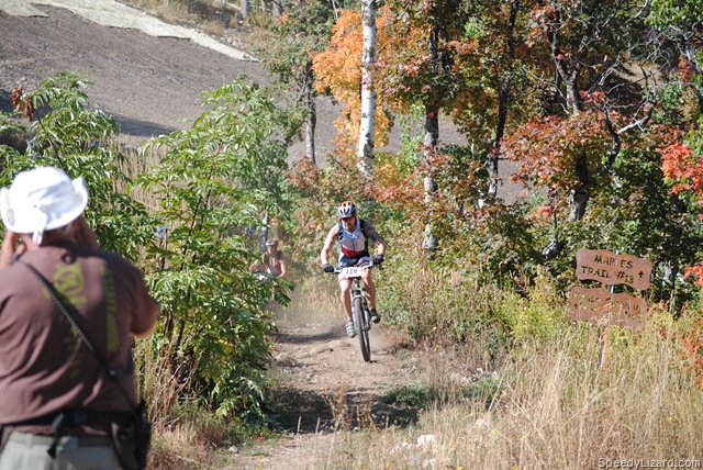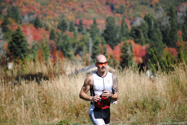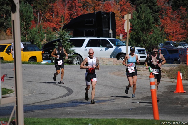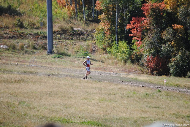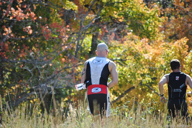 Coming out of T2, I squeezed by my buddy, Mike Miller (#274) and gave him a friendly elbow to the ribs. “What’s up, brother?” I asked as I passed by. We ran up the ski slope together and even power-walked the steep, steep section together conversing about our leg woes. As we dove into the single track at the top of the hill, I said, “Come on, let’s go.” He followed behind. I picked up what felt like a comfortable, yet fast, pace through the beautiful mountain-side.