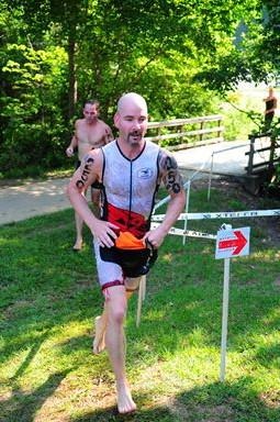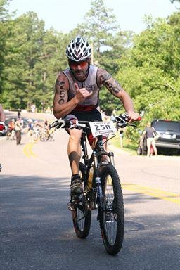 About the time I made that conclusion, another one flew through one of the vents in my helmet and started stinging me on my forehead. I winced. I squinted my left eye. I shook my head. I tried everything I could without taking my hands off the bars in a very tight, twisty section of the trail. When I finally had an opportunity to take my hands off the bars, I banged my helmet. Nothing. Knowing I couldn’t continue a Popeye ride, I loosened my helmet a bit and slid it back on my head, back and forth, until either it flew out or was squished, all without stopping my pursuit of the fellow 40 year old. I followed him for the rest of the bike leg and passed him entering transition.