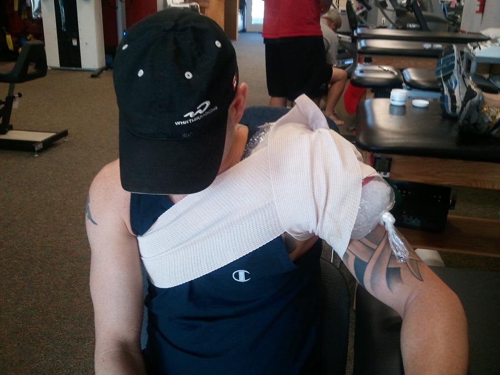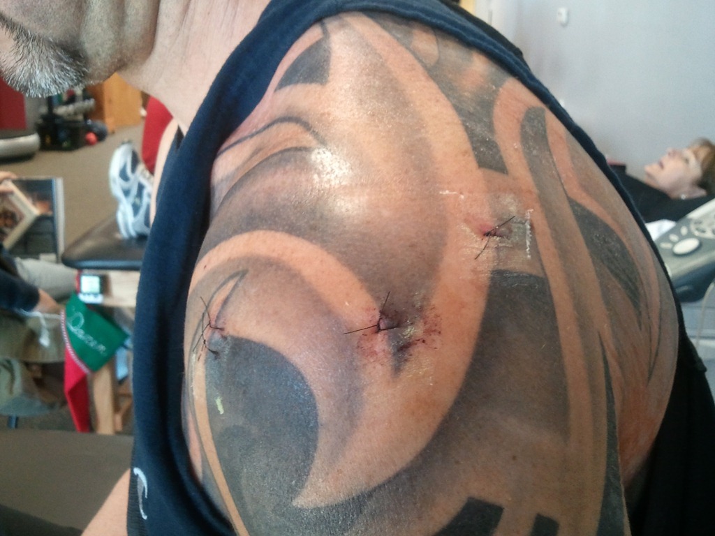 4. About a week later I went in and had a subacromial decompression with bursectomy on my left shoulder. In English, they poked three holes in my shoulder, inserted some form a dremel tool and ground down my shoulder bone. Meanwhile they sucked out a bunch of inflamed tissue. Thus begins many, many weeks of therapy and even some silly thoughts about giving up racing altogether. Of course, once I came off of the pain meds, I came to my senses.