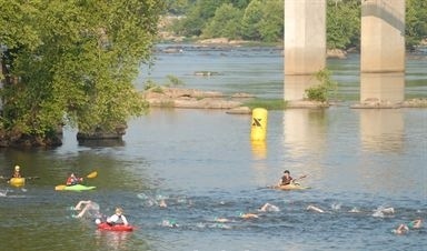 The swim was the classic Richmond swim across the James River. Classic as in it’s more of a swim/crawl/run since the water is so shallow. They incorporated a zig-zag pattern where we would have to make a right turn around buoy 1, left turn around buoy 2, right turn around buoy 3, run across the island, back into the river, right around buoy 4 (flag in a sandbar), left around buoy 5 and then a final sprint to shore. I would have to say that it was the most interesting swim I’ve ever participated in. I caught up with the tail-end of the previous wave of swimmers that started 2 minutes ahead of us.