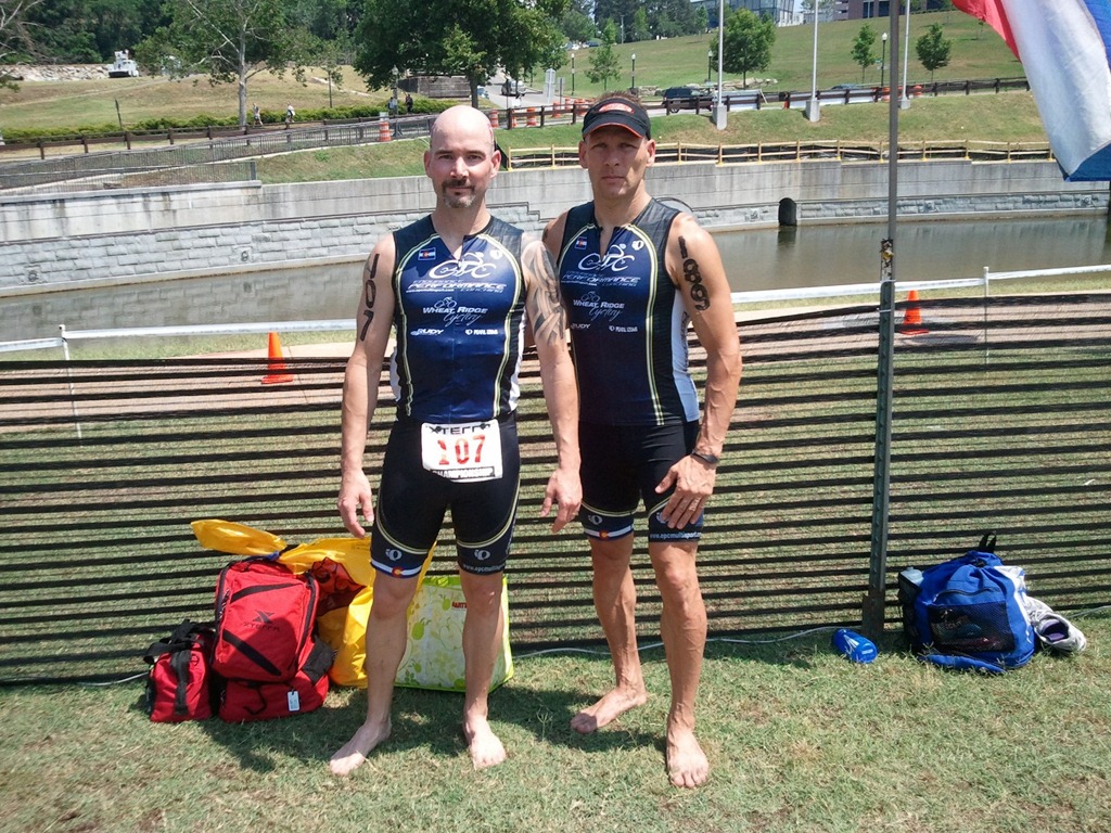 I had a fun bike leg. Since I had already caught up with the previous wave of bikers, I fought through traffic for most of the first lap of the two-lap bike course. Towards the end of the first lap, my good friend and fellow age-group athlete, Frank Fernandez-Posse caught up with me. He passed me on a gravel road just before we had to climb a long zig-zag ramp that takes you from river level up to a neighborhood. We both had issues getting up the damp, wooden ramp and ended up running up it with our bikes, conversing along the way. We rode side-by-side through the neighborhood and he took the lead as we dove back into single-track. He slowly pulled away from me as I got caught up in traffic and I would not see him again for the rest of the bike leg. “Damn, this is just like Pelham with him leaving me,” I thought.