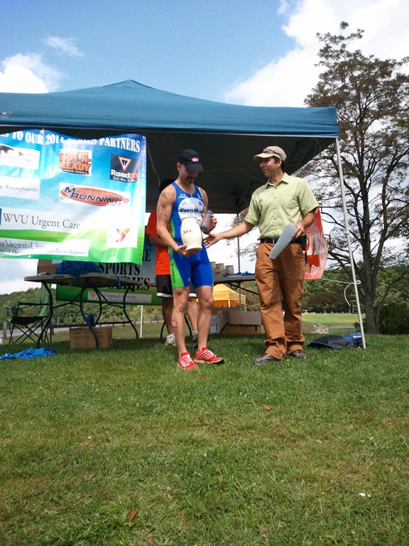 As I looked up, some guy comes over and shakes my hand. “You won it.” he said. I was puzzled on two accounts. Did he mean I won the race or my age group? Also, his voice sounded familiar, very much like the guy who almost passed me on the bike leg during the technical downhill. Sure enough it was him (him being Brian Menzies), but he was dressed already.