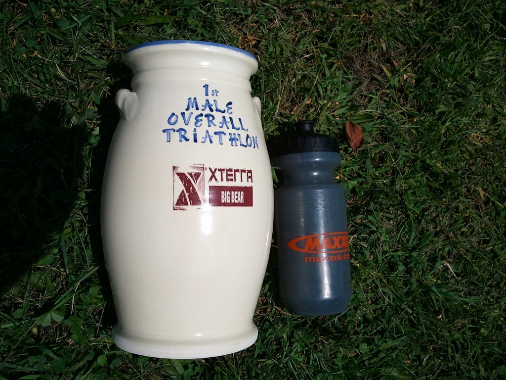 Sure enough, I won first overall, which I didn’t believe until I viewed the results. Apparently, the two empty bottles at the second run water stop were from relay teams: one triathlon and one duathlon. Not too shabby, huh? The prize was a SWEET clay urn with the placement inscribed along with the XTERRA logo.