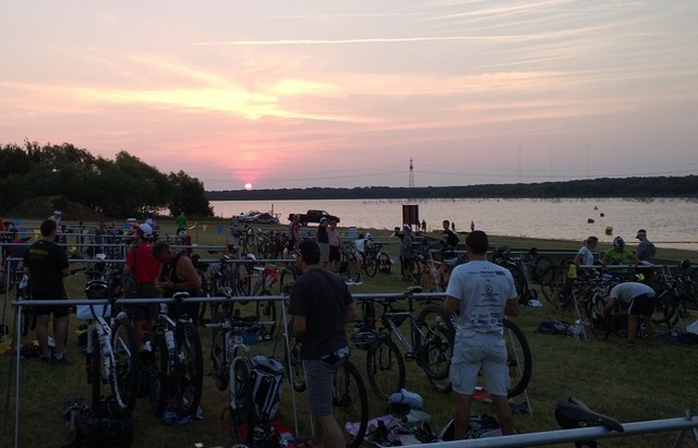 Mandatory pre-race briefing led right up to the start of the race, so there was no time for swim warmup. Bummer. We started off with a 600 meter swim. Even though it was a short swim, my swim felt “flat”, but I knew with the hot water and the upcoming hot bike, I didn’t want to overdo it. I may have been a bit over-cautious as my swim was waaaaay slower than I wanted it to be: 11 minutes, 12 seconds which was 20th fastest. Ugh.
