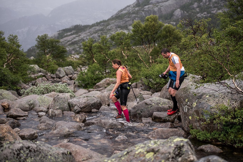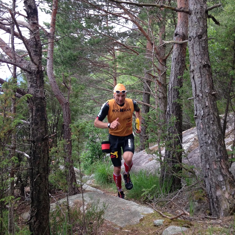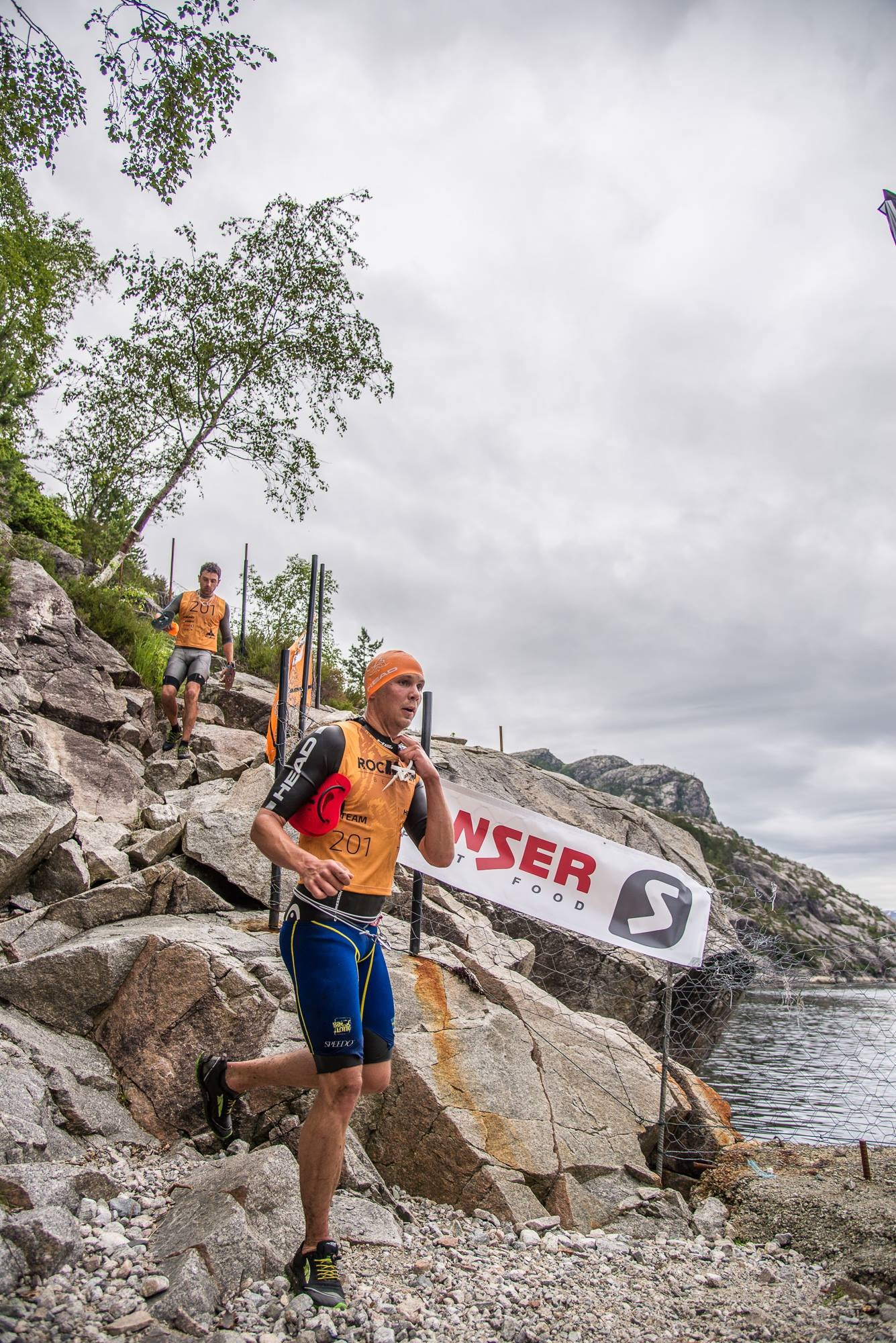 After three short swims and two short runs in-between, we started the long, arduous climbing of 1500 or so additional feet. By the time we got to the first checkpoint, Preikestolhytta, we were in 5th place. This checkpoint was at a parking lot at the base of Preikestolen, or more commonly referred to as “Pulpit Rock”. This rock formation is a popular tourist spot and would be our second checkpoint. The climb up to Pulpit Rock was a pretty tough climb, even though there were stones stacked to form “steps” in places. Imagine “running” 1500 feet on this: