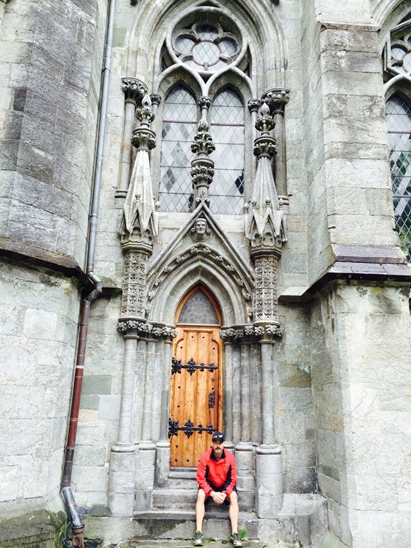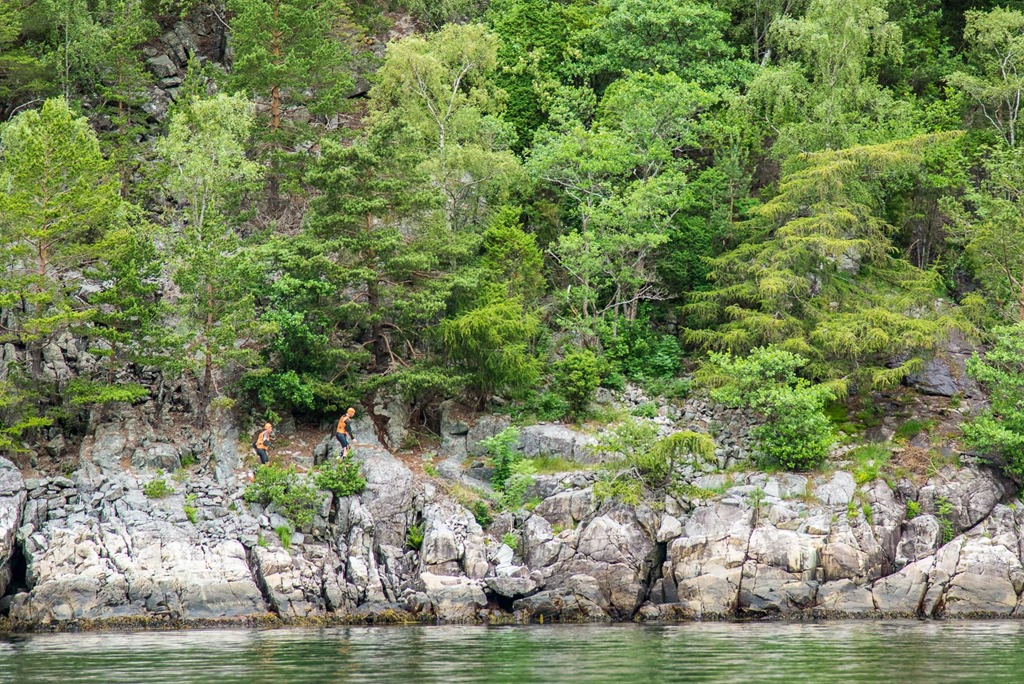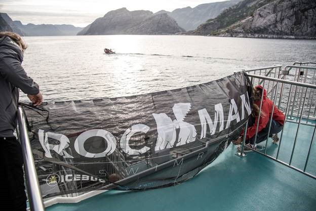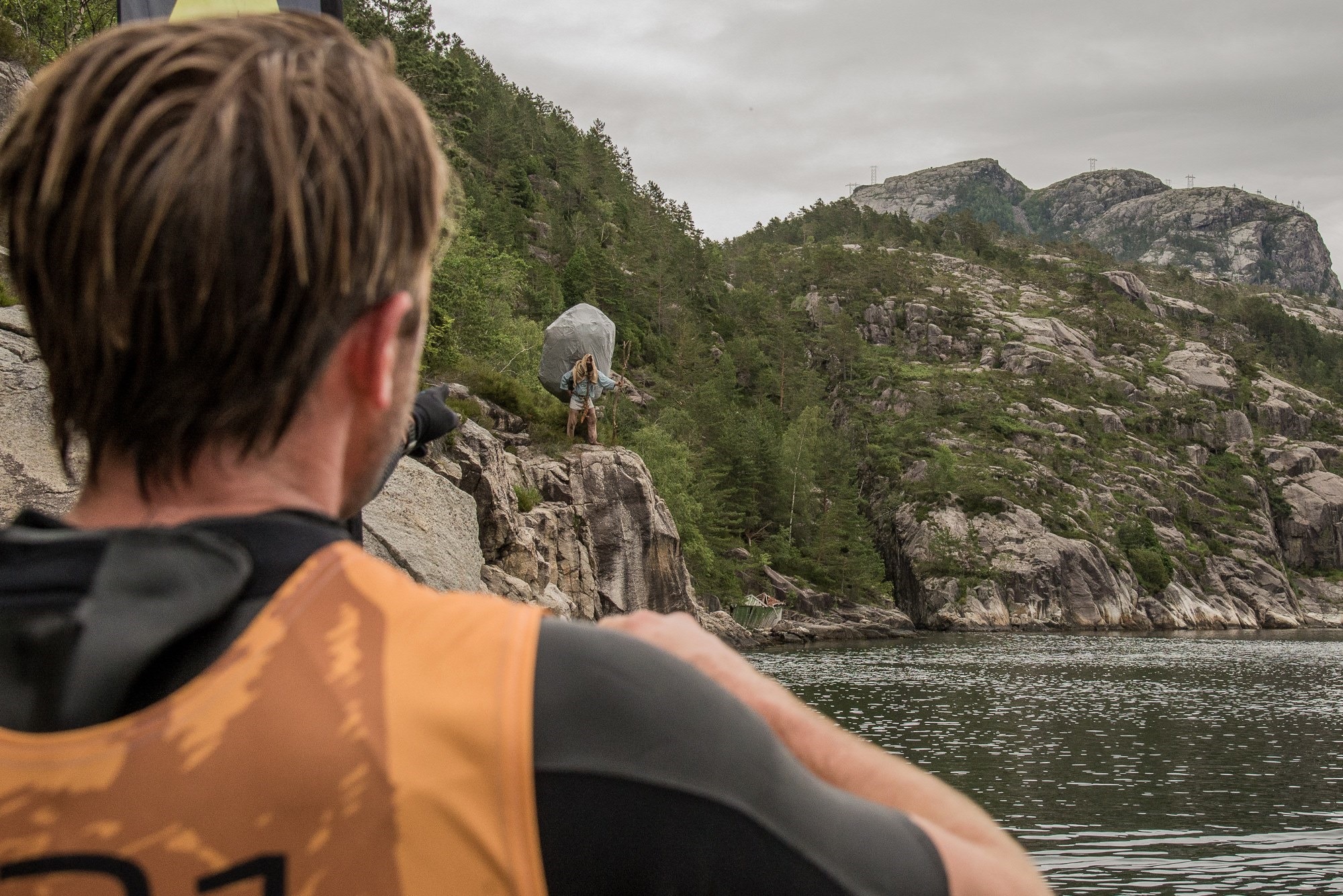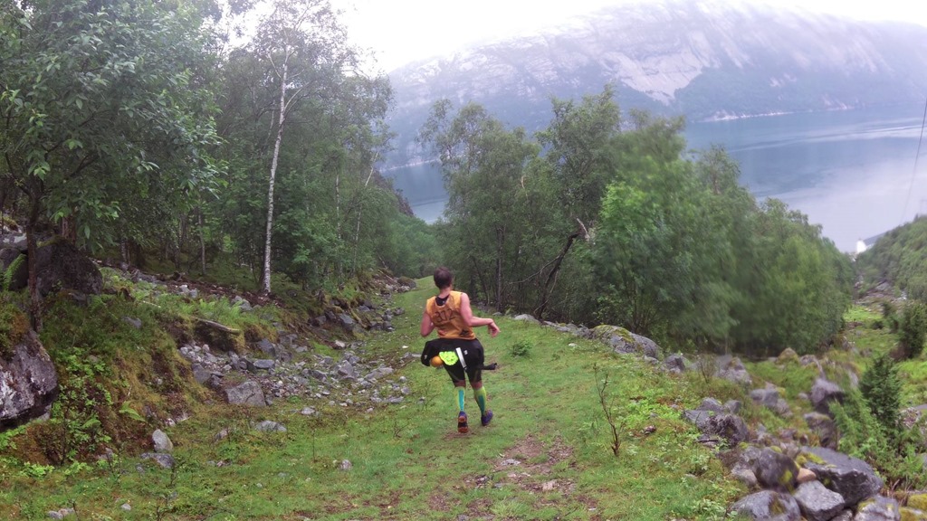 Another steep, technical descent down to the fjord and we make it a group of girls at the docks making sure we had our safety buoy. The spectator ferry had pulled up in the distance and we could see Bjorn on deck. Here’s a pic from the ferry. Yes, we had to run down those rocks.