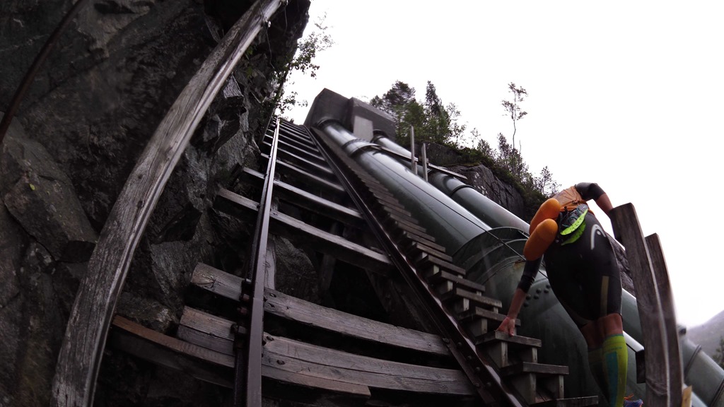 Ahead of us were the famous 4444 steps to get to the top of the mountain. The tallest wooden staircase in the world, it would take us from sea level to 2500 feet in 1 mile. On the staircase, we passed team 222. It was a tough-as-hell climb with the stairs getting VERY steep in spots. I stumbled twice, falling forward onto the stairs but we never stopped. If you look carefully at the picture below of me and Dan climbing the stairs, you’ll see swimmers still crossing the fjord below (click on the image to make it larger).