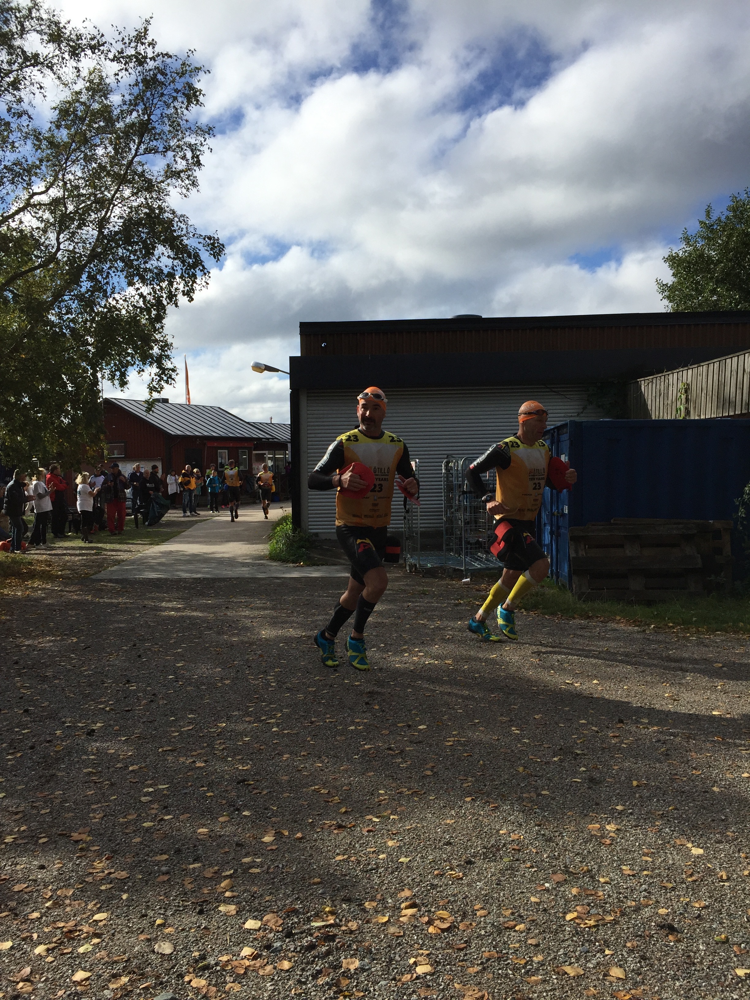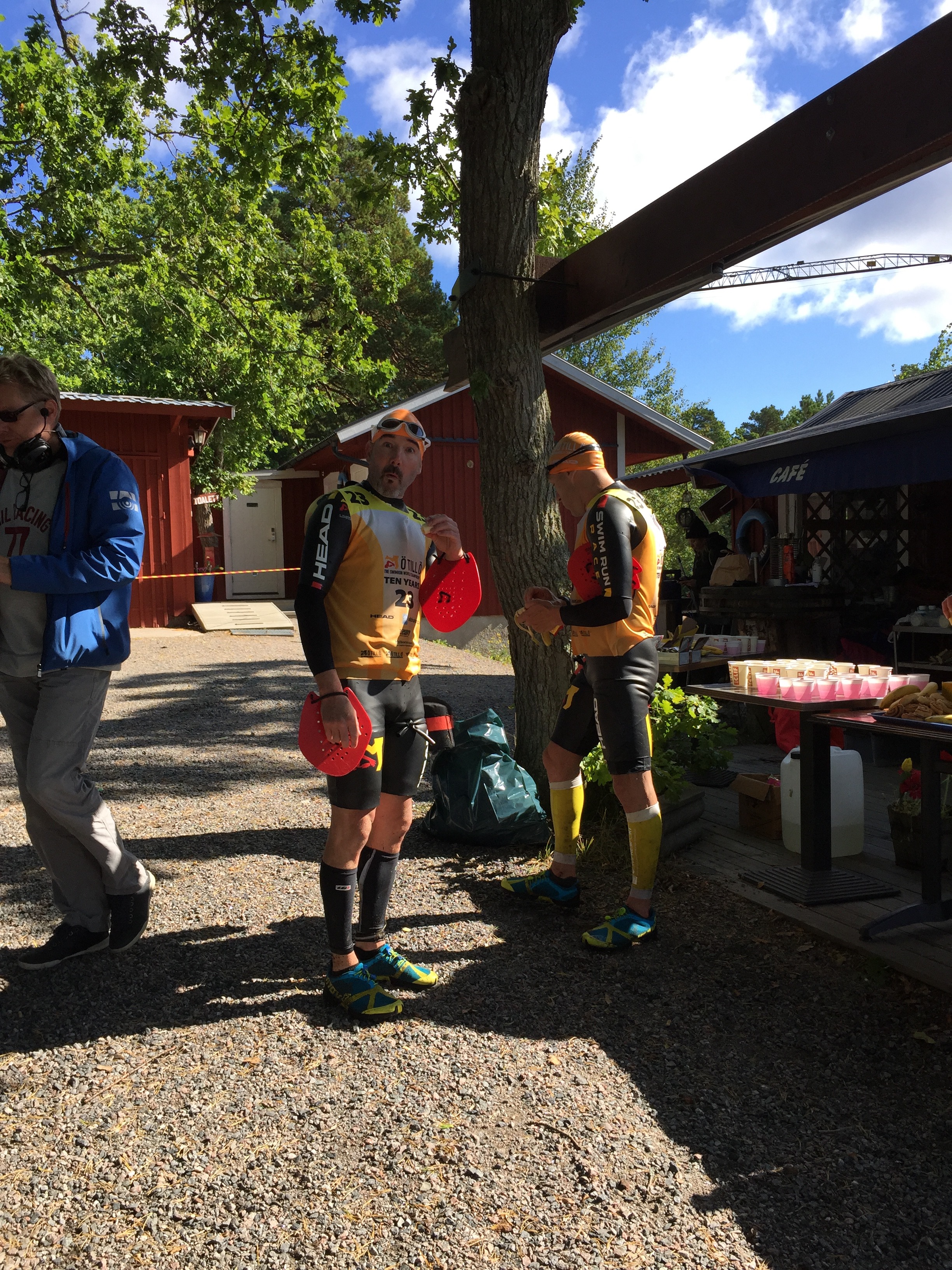 The local Swedish residents of the islands were phenomenal. We were cheered on as we passed through towns and villages, from island to island and even farmland where we encountered gates that “must be opened and closed behind you so we don’t have farm animals getting loose.” Many of the natives setup their own water stops. We turned one corner on a gravel road where an entire family were setup with cups of water and a water hose to shower you down had you gotten too warm in your suit. It was during the 13 mile run and was welcomed. It was probably the only point in the race that I felt hot. Another water station was literally in a lady’s front yard, complete with all the trimmings including hot dogs. As we stopped to get a drink, she had a list of the teams and greeted, “Welcome Daniel and Marcus! Where are you from?” After replying that we were from USA, she asked if we were going to take the lead. I smiled, hugged her and politely explained that it was unlikely to happen. She shouted “GO USA” several times as we ran out of her front yard.
