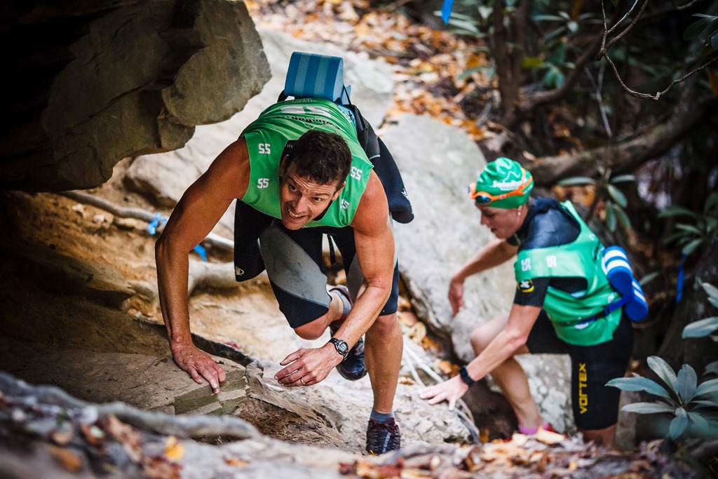 But one of the coolest parts of the race course was the larger falls that included some hand-over-hand climbing and beautiful scenery. Here’s Team Tiger Cub, the winning mixed team, made up of Lawrence (L) and Jaime Brede (R) showing how to tackle some of the terrain.