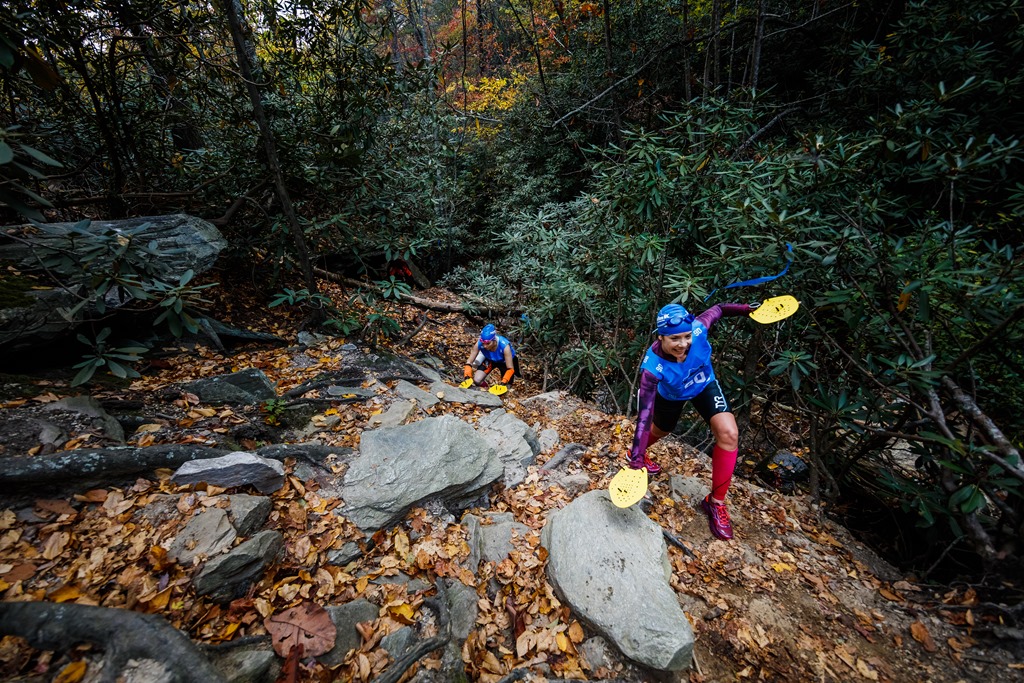 Continuing the climb consisted of another water fall a little higher along with more tough, technical climbing. Once clearing all of that, we had to run up railroad tie steps that lead to the parking lot of the Hanging Rock Park visitors center. Here, Amy Nalven (L) and Bettina Shepard (R) of team Jersey Rocks, navigates the climb. Can you guess where they’re from?