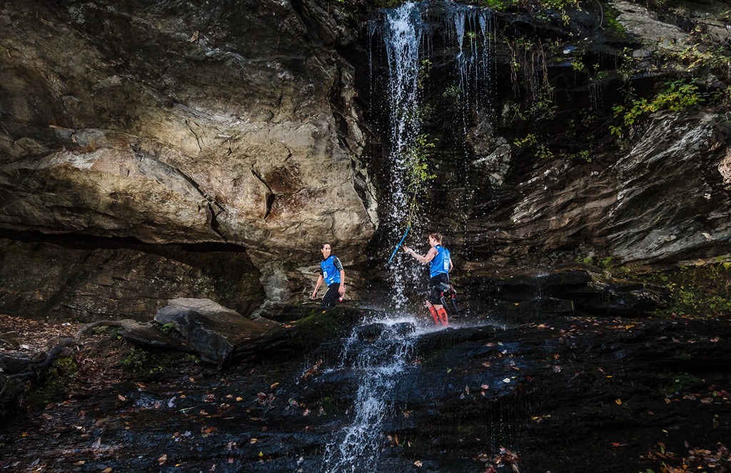 This leads you up to a larger waterfall that you have to traverse before continuing your hand-over-hand-climb. Some racers went behind the water, while others took the quickest line which was right through it. Here’s winning female team, Have We Met, Misty Beccera (L) and Sophia Chadwick (R) taking the fast route. True to their team name, these two fast ladies met for the first time the day before the race.