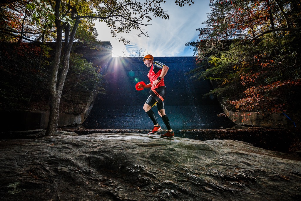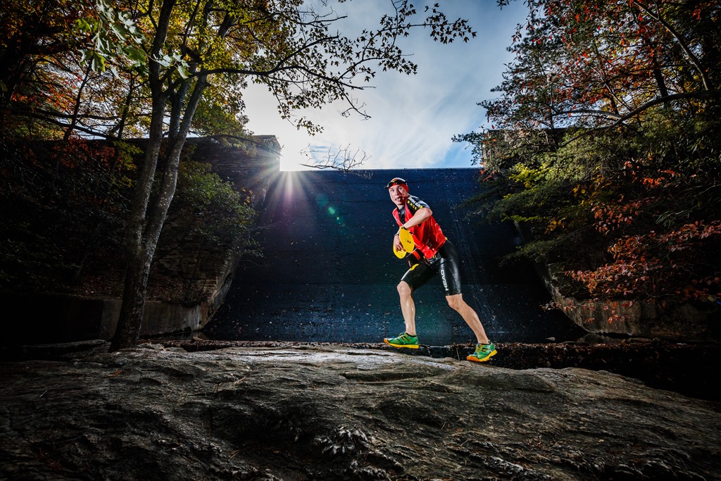 The above picture is a view from the dam where the swim entry and feed station was set up. We had to do a 500 meter swim to the end of the lake and then a trail run back to the dam. On the way back there was another short 25 meter swim across a cove and a steep technical descent down to the spillway and back up to the feed station. Once completing one of these “laps”, we’d do it again before continuing our climb up to the top of Hanging Rock. If you’re keeping count, that’s 1050 meters before going up. On the way back down from Hanging Rock, we’d have to do the two “laps” again for another 1050 meters